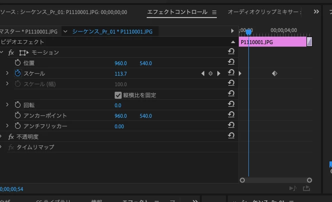 これができないと、スライド映像を作る際に、「スケール」単独でのエフェクトが全くかけられないです。