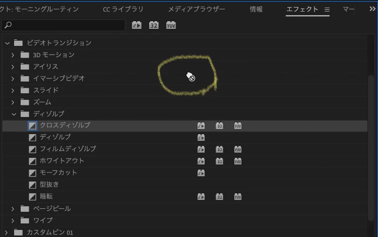 という部分ですが、添付していただいた画像では「クロスディゾルブ」のエフェクトを「イマーシブビデオ」のフォルダに入れようとしている状況ですので、「その操作はできません」という意味で禁止アイコンが表示されています。