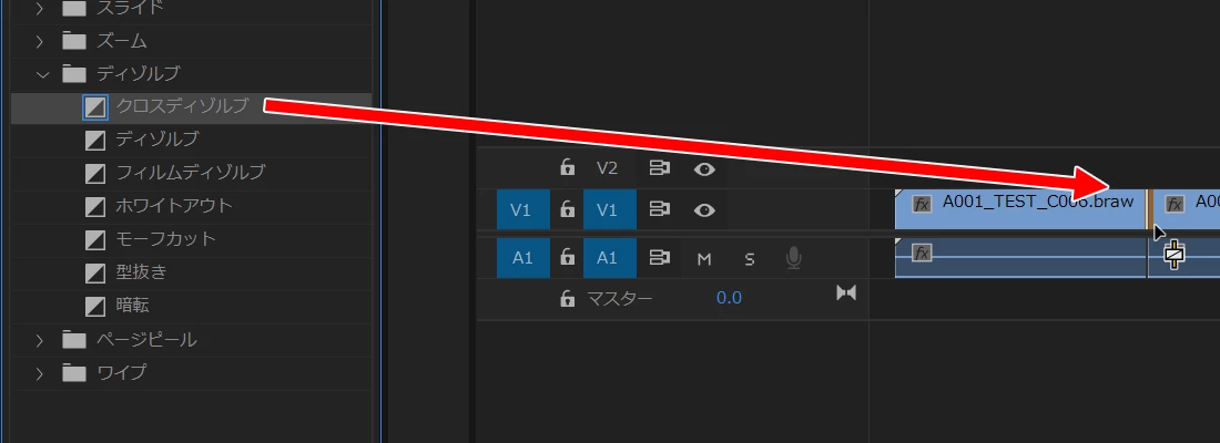 タイムライン上の、クロスディゾルブを使用したいクリップとクリップの間に、「クロスディゾルブ」をドロップします。
