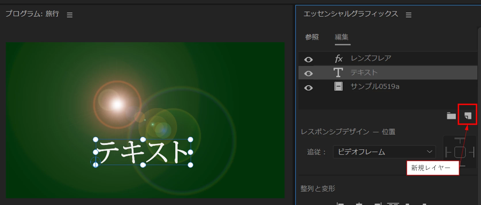 参考ですが、カラーマットファイルを「エッセンシャルグラフィックス」パネルの「新規レイヤー」から読み込み、グラフィッククリップに「レンズフレヤー」エフェクトをかけると下図のようになります。