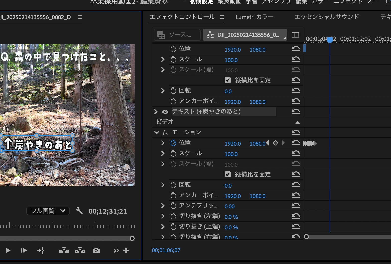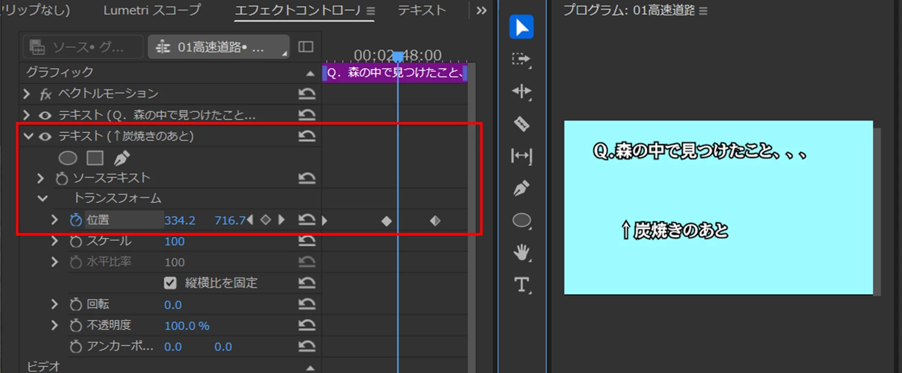 ③「テキスト(↑炭焼きのあと)」の「トランスフォーム」の「位置」にキーフレームを打ちます。