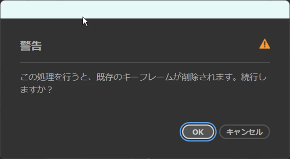 「モーション」の「位置」の左端の「アニメーションのオン/オフ(ストップウォッチ)」アイコンをクリックし、開いた「警告」ウィンドウで「OK」をクリックします。