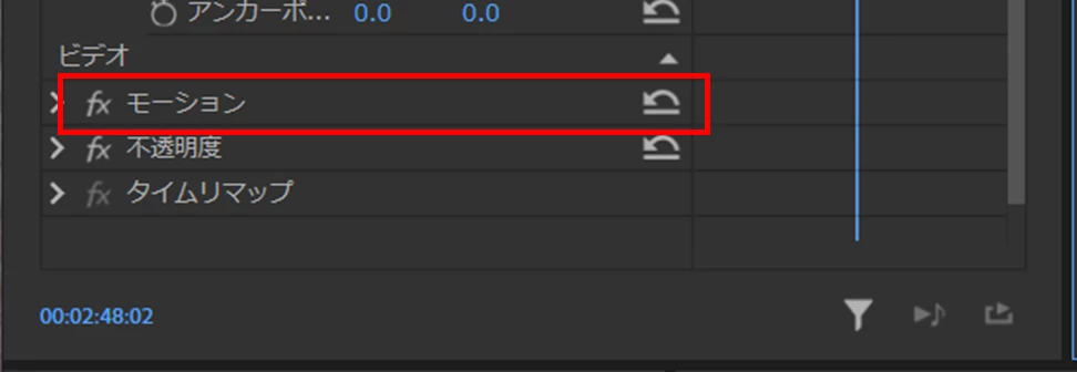 ②「モーション」の右端の「左向き半円アイコン」をクリックします。すると「モーション」内の各プロパティの数値がリセットされます。