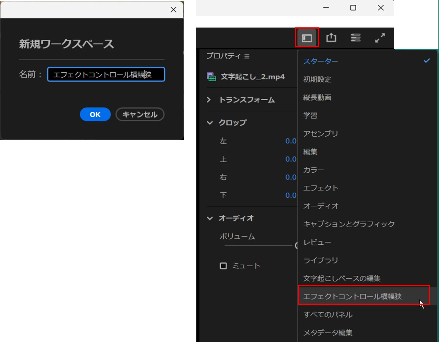 現在使用しているワークスペースで、「エフェクトコントロール」パネルの横幅を狭め、メニューの「ウィンドウ」→「ワークスペース」→「新規ワークスペースとして保存」を選択します。