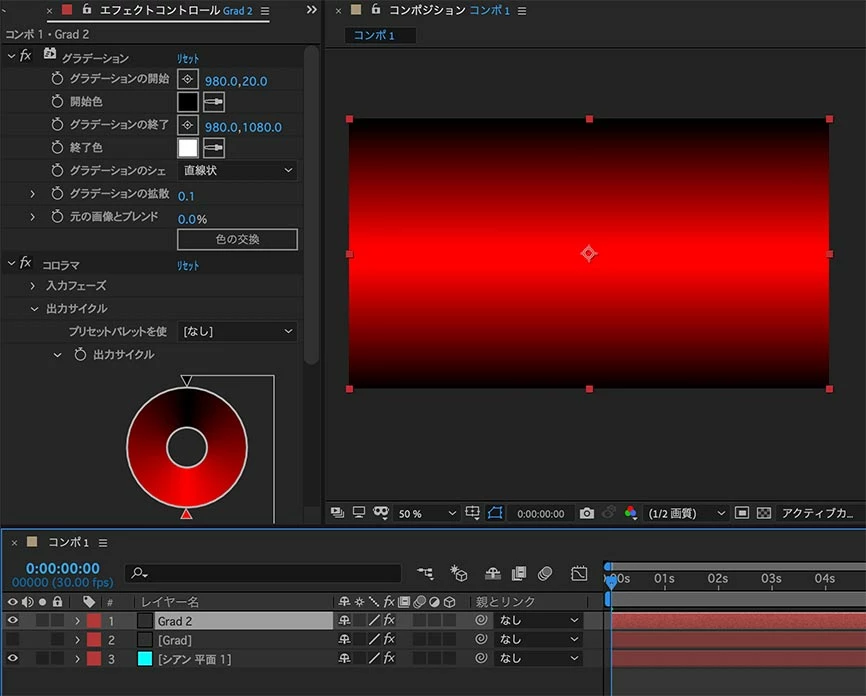 カードダンスは、あらかじめ最大2種類のグラデーションマップを作成しておいて、「グラデーションレイヤー」に割り当てて、各プロパティを操作すると長方形が変形します。