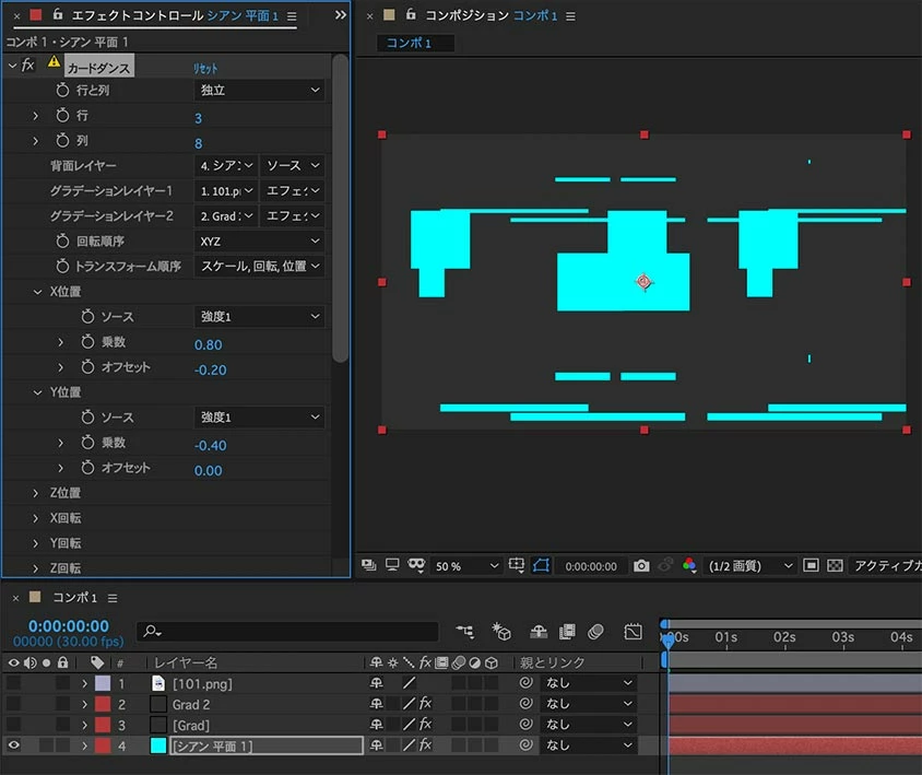 長方形を移動・拡大縮小または2種類の画像を重ねたりするシーンが多いようなので、After Effectsのエフェクト「カードダンス」で再現できるかもしれません。