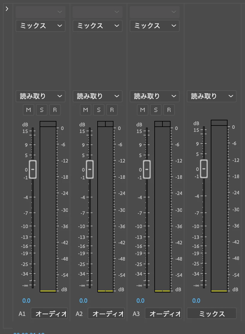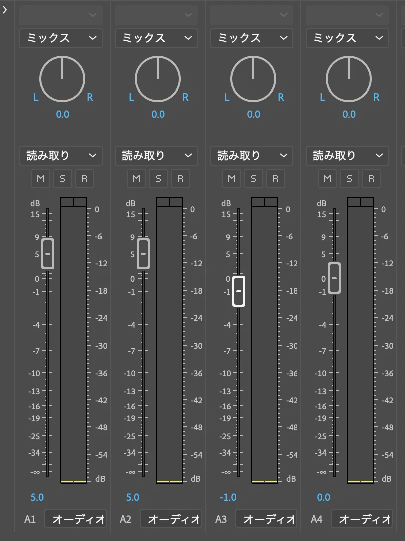 オーディオタブを開いて、トラックミキサーを見ると、特定のシーケンスだけ、LとRに振り分ける丸いやつがありませんでした。