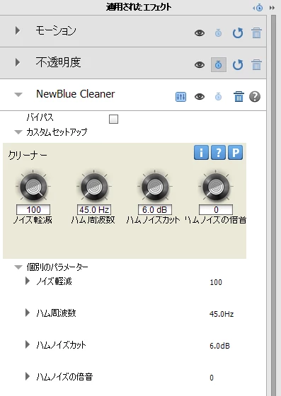 Premiere ElementsのNewBlue Cleanerは下図のようなエフェクトですね。最近のバージョンでは廃止になってしまいましたね。