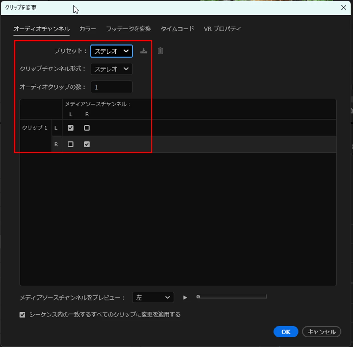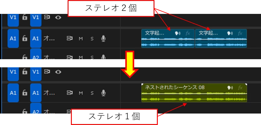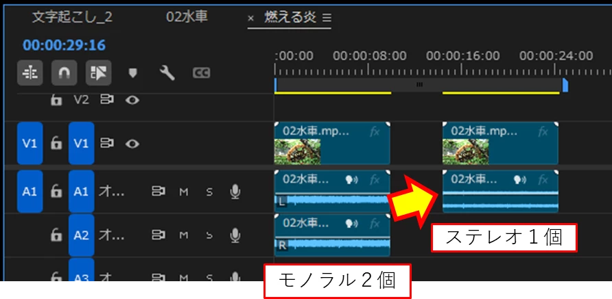 オーディオクリップが2つあるのはステレオだからだと思うのですが、モノラルにしないで2つにまとめる方法はありませんか?タイムラインを広げたいです