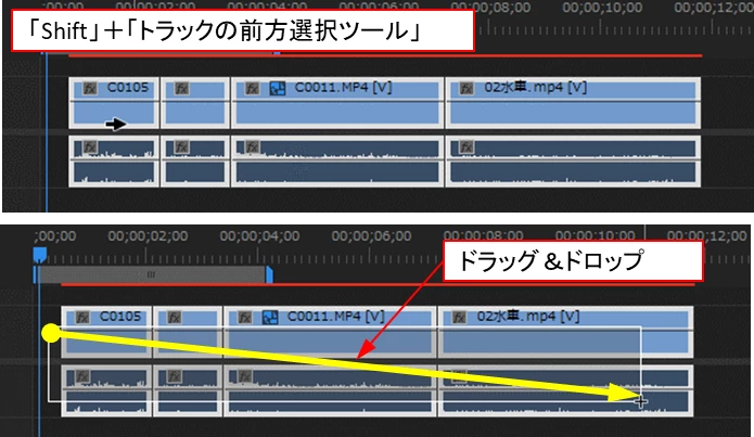③「Shift」+「トラックの前方選択ツール」で対象のトラックを選択します(下上図)。または対象のクリップをドラッグして選択します(下下図)。