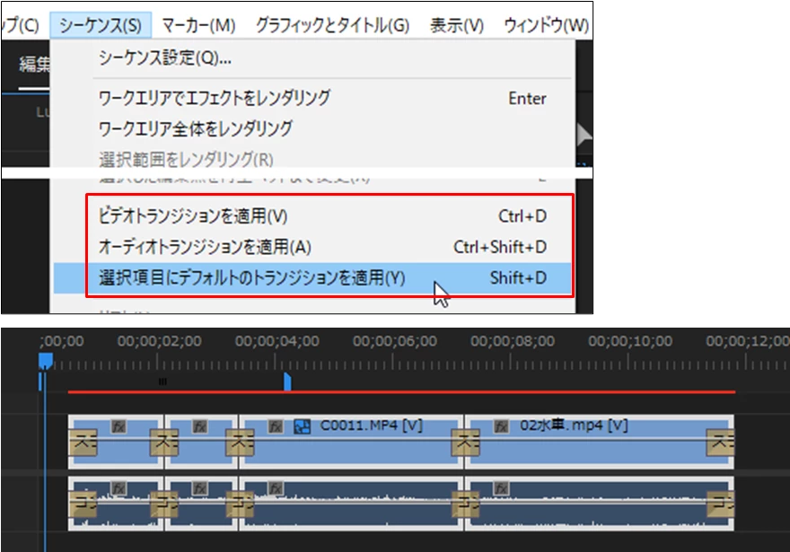 ④ビデオトランジションとオーディオトランジションの両方を適用するには、メニューの「シーケンス」→「選択頭目にデフォルトのトランジションを適用」を選択します。