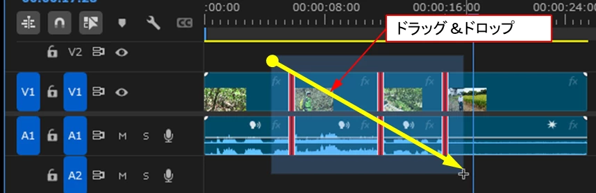 ③Ctrl(command)キーを押しながら編集点を囲むようにドラッグ&ドロップします。編集点に赤白の線が入ります。