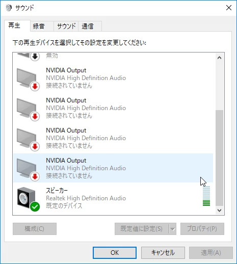 この画面の例では一番下にある、既定のデバイスとなっているものが、現在Windowsの音声が出ているデバイスです。何か音が鳴る操作をしてみて、左側のレベルメーターが振れて音声が出ることを確認します。