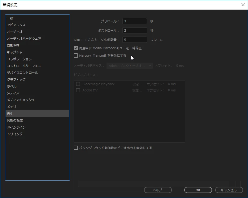 次に、Premiere Proの環境設定をひらき、「再生」の項目を確認します。