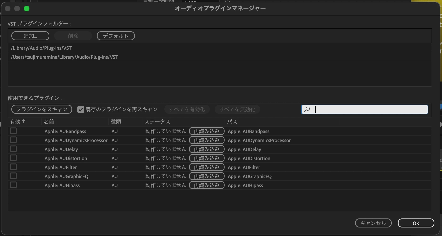 オーディオプラグインマネージャー上の存在しないファイルを削除したいです