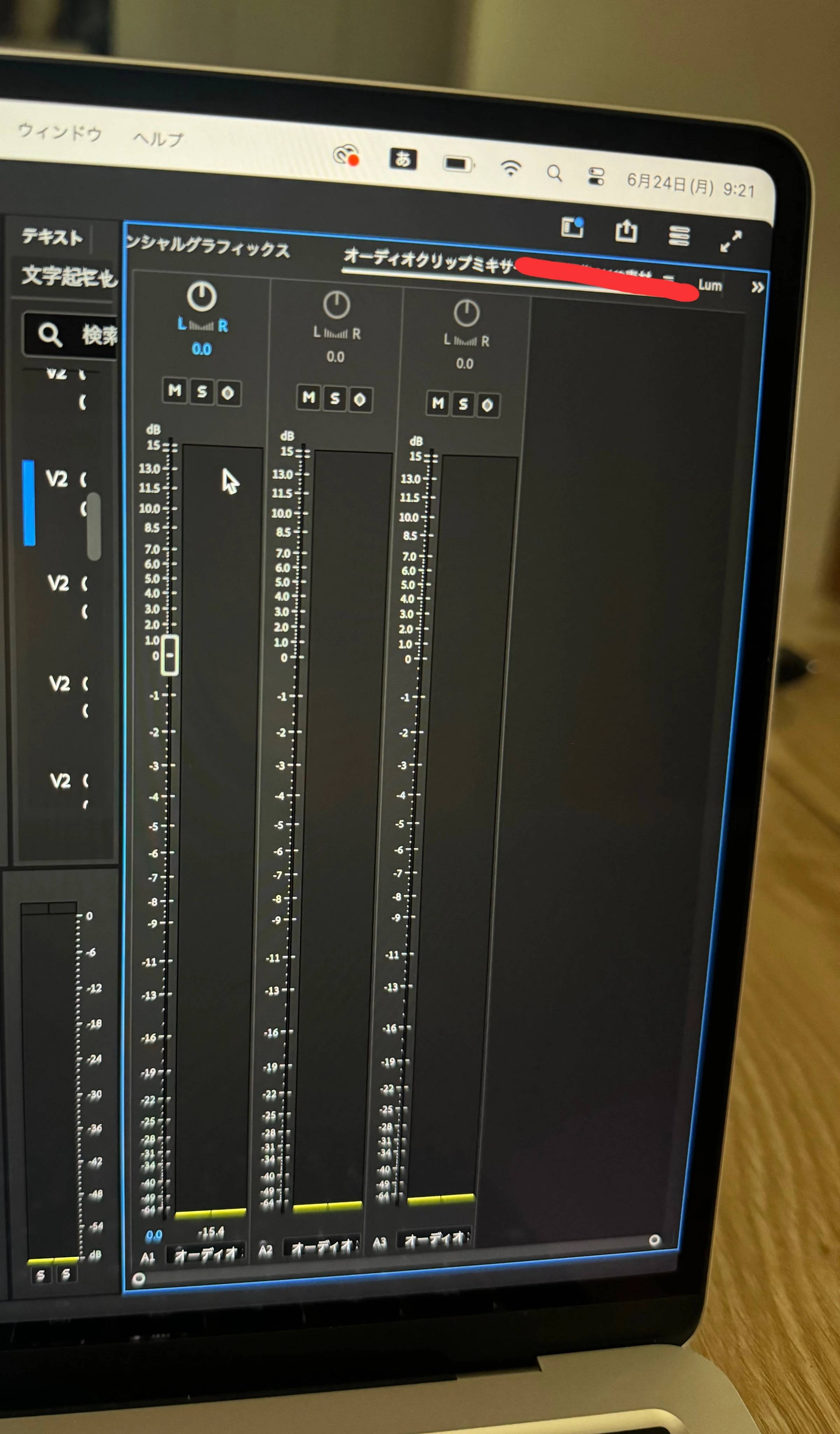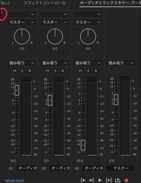 オーディオトラックミキサーの赤丸をつけている左上の矢印が表示されません。