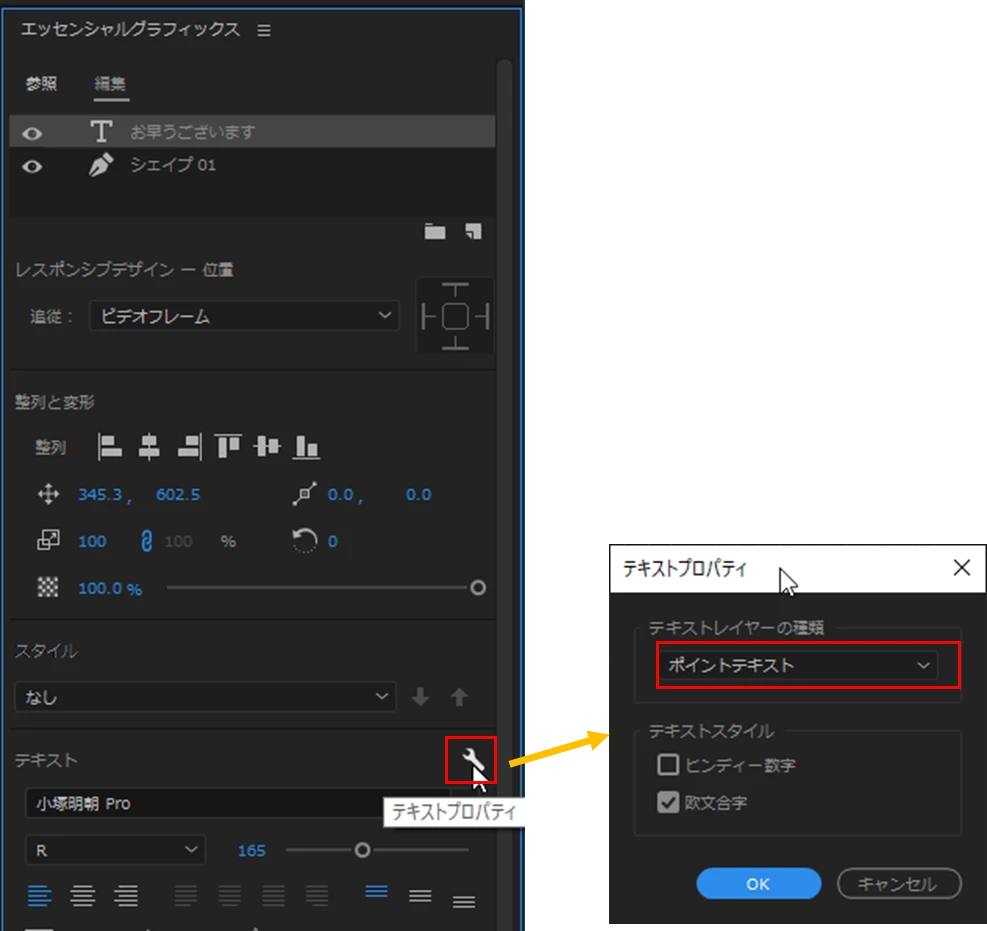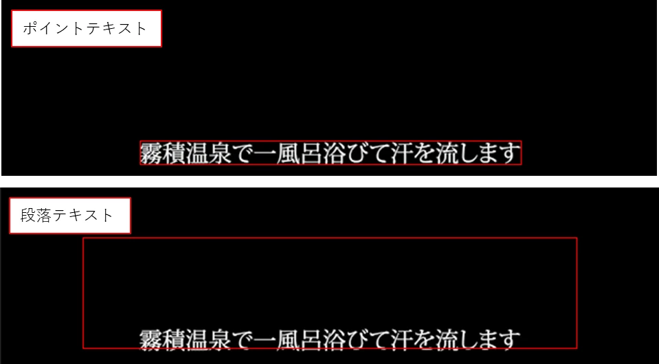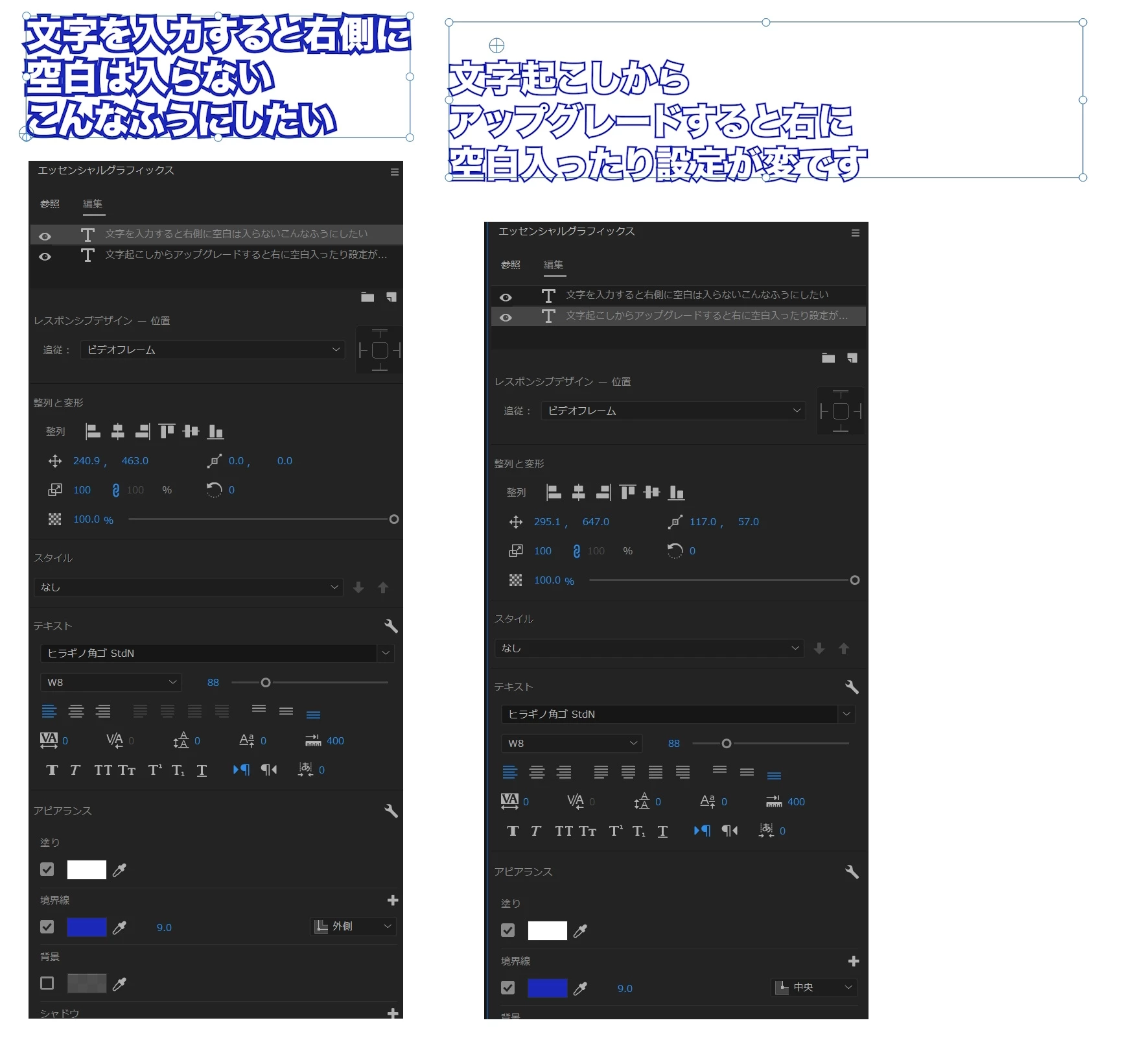 フォントの配置設定は同じはずなのですが、字幕からアップグレードしたほうは何故かバウンディングボックスの右側に空白が入ってしまいます。