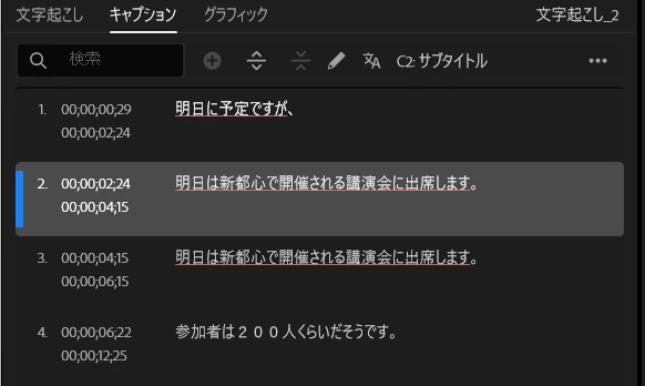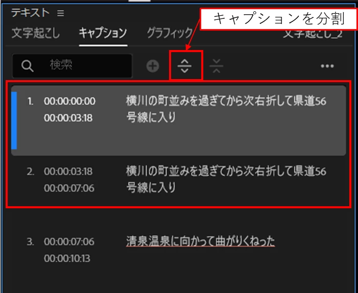 文字起こしから生成したキャプションを分割しようとすると本来2つに分割されるところが、3つに分割されます。ショートカットを使用してもしなくても同様の現象が起こります。