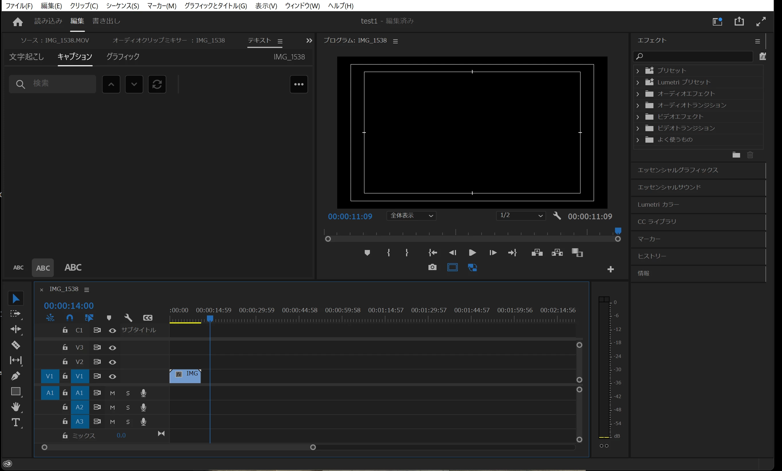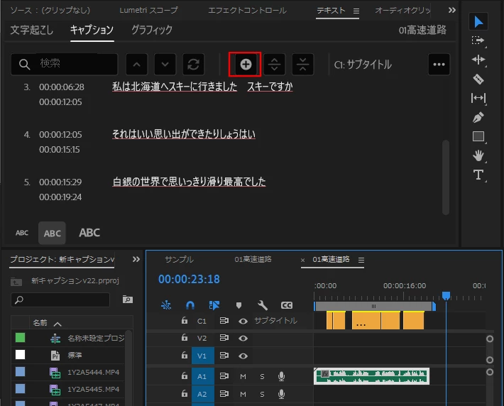 ①今、外出中で、Premiere Proに触れられないのですが、「キャプション」パネルの横幅を広げてみます。