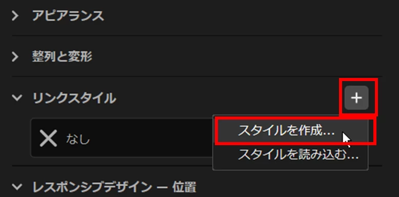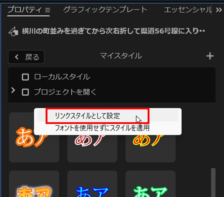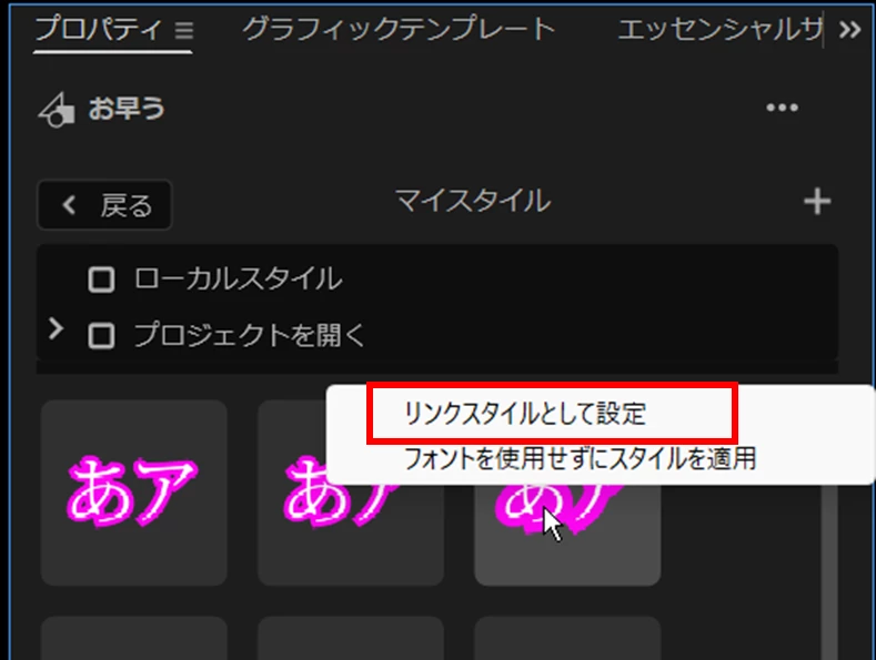 「スタイルブラウザー」の対象の「スタイル」の上で右クリックし開いたメニューから「リンクスタイルとして設定」を選択すると、「プロジェクト」パネルにそのスタイルが登録されます。