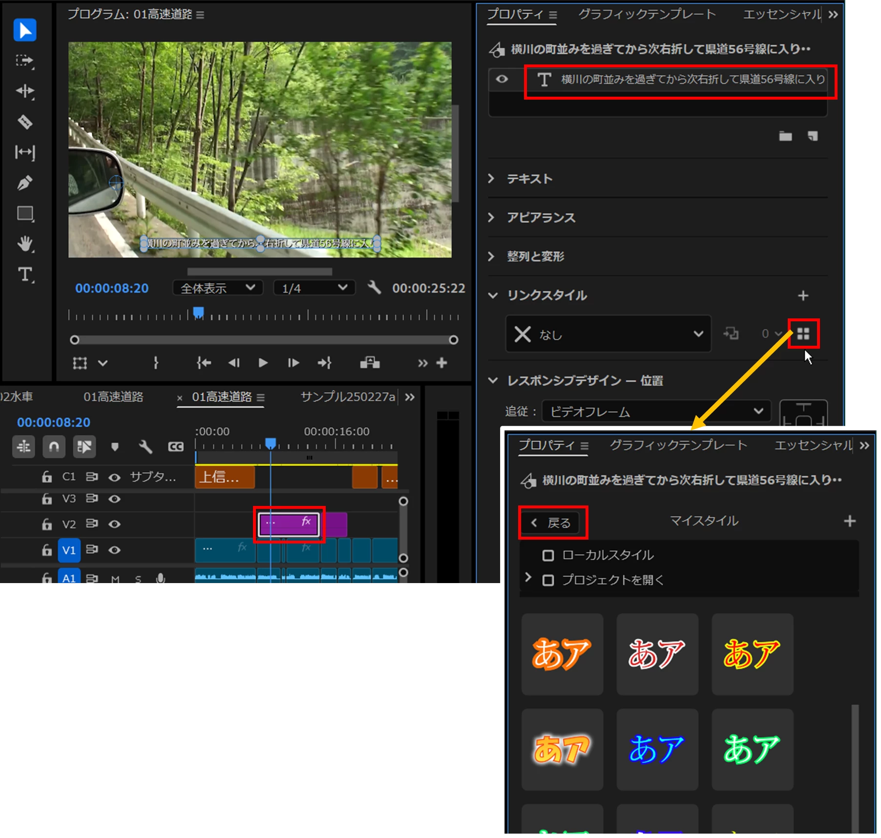 「キャプションをグラフィックにアップグレード」に変換したクリップ(紫色)を1個選択し、「プロパティ」パネルで「テキストレイヤー」を選択すると、「リンクスタイル」項に「スタイルブラウザー」アイコンが表示されます。このアイコンをクリックすると、「スタイルブラウザー」が開きます。