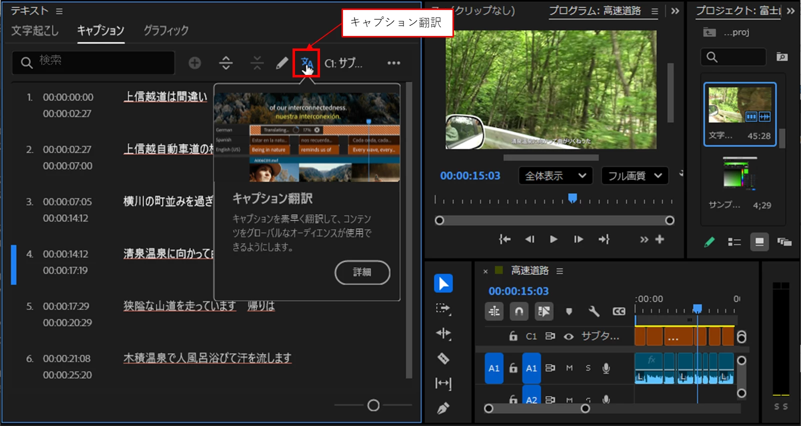 Premiere Proが起動しますので、対象のプロジェクトを読み込み、翻訳を試してみます。