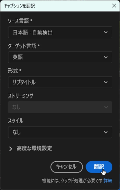 ③開いた「キャプションを翻訳」ウィンドウで「ターゲット言語」を指定し、「翻訳」をクリックします。