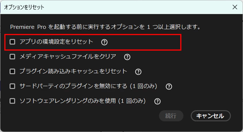 Premiere Proをいったん終了し、「Ctrl」キーを押しながらPremiere Proを起動します。すると、「オプションをリセット」ウィンドウが開きますので、「アプリの環境設定をリセット」にチェックを入れ「続行」をクリックします。