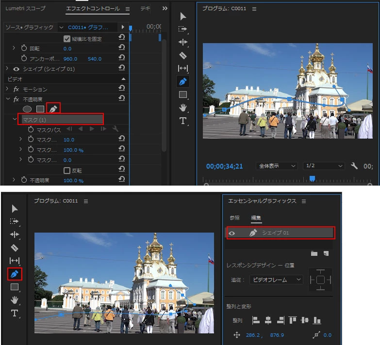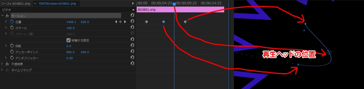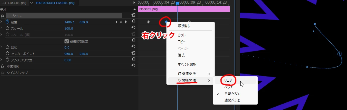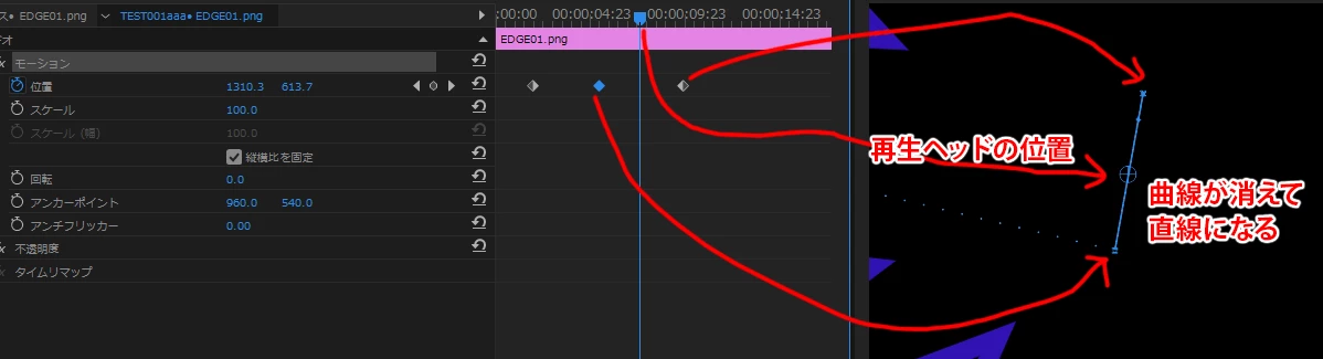 キーフレームがプレビュー画面で見ると曲がってしまっているのですが、この曲線を消したい場合どうすればよいでしょうか?