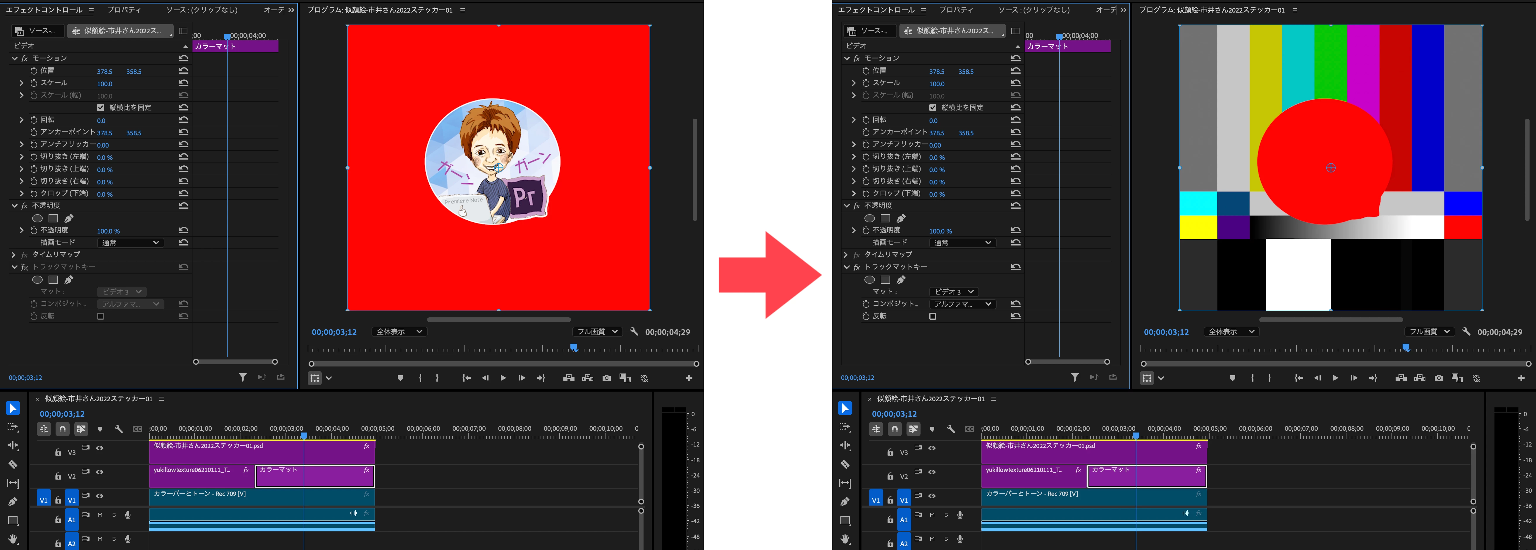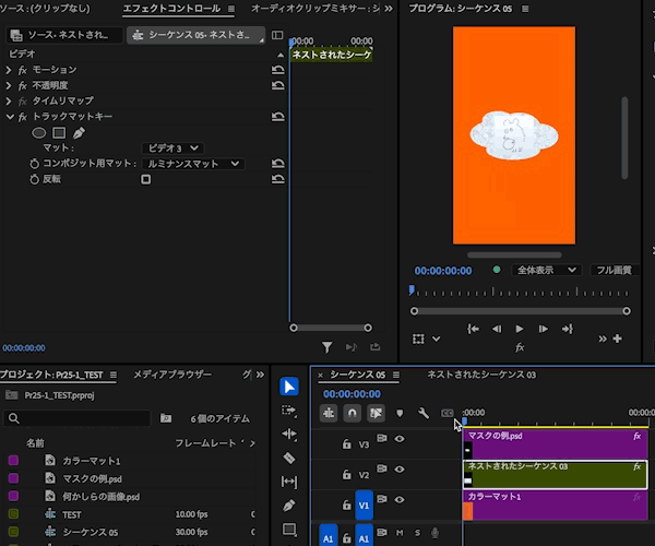 また、「トラックマットキー」は少しクセのあるエフェクトなので、位置やスケールを変更する際にネストを併用するなどの工夫が必要になることもあり、慣れが必要なエフェクトだと個人的には思っております。