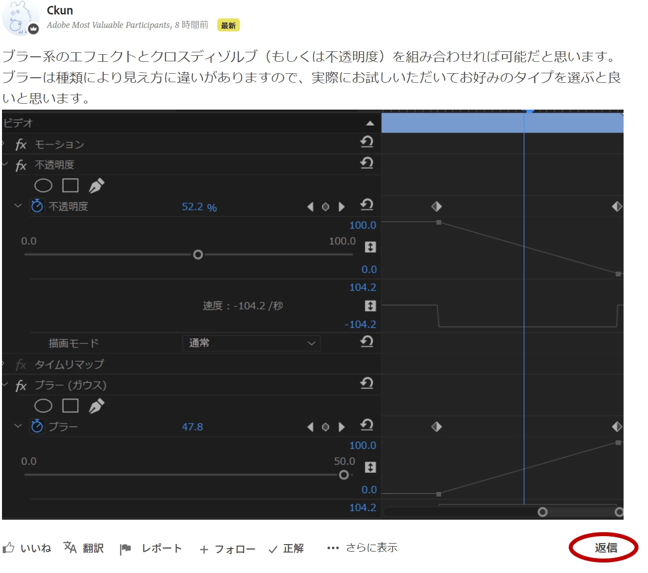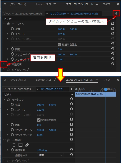 動画のクリップのエフェクトコントロールに不透明度のキーフレームは愚か、左のストップウォッチのマークも出てきません。