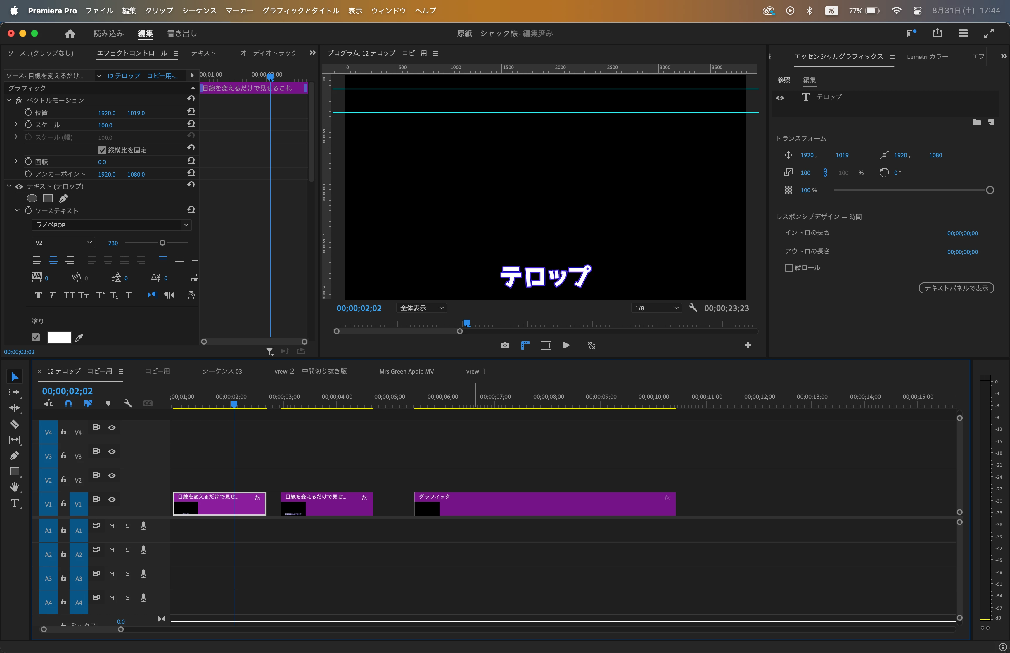 ⑤すると、キャプションセグメントクリップがビデオトラックでエッセンシャルグラフィックステキストクリップに変換されます。
