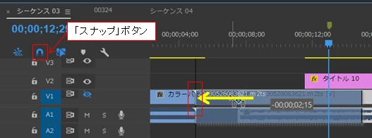 推定ですが、クリップを左側のクリップにピッタリ繋げる時のことですよね。通常は下図赤枠で囲った部分に「▼」が表示され、ピタッと吸い付きますよね。