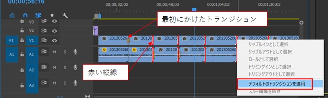 ⑤2個目以降のトランジションをかける部位のクリップの端を全箇所選択し(2個目以降は「Shift」キーを押しながら選択)、表示された赤い縦線の上で右クリックして開いたコンテキストメニューから「ディフォルトのトランジションを適用」を選択します。