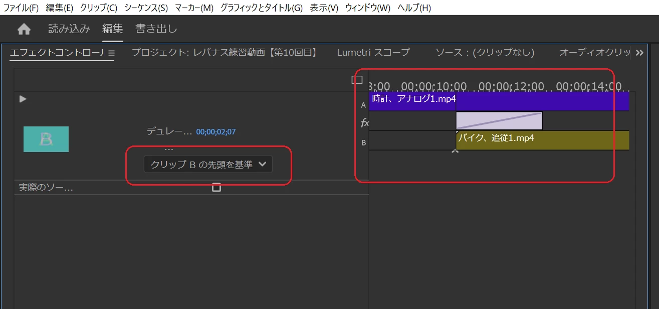 どうしても「クリップBを先頭を基準」の設定になってしまいます。