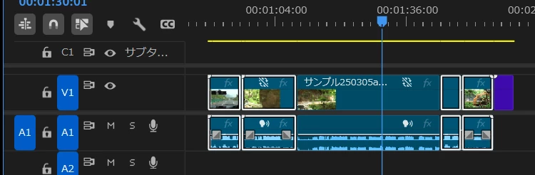 ②あらかじめクロスディゾルブをかける(余りしろが無いため右クリップの先頭に