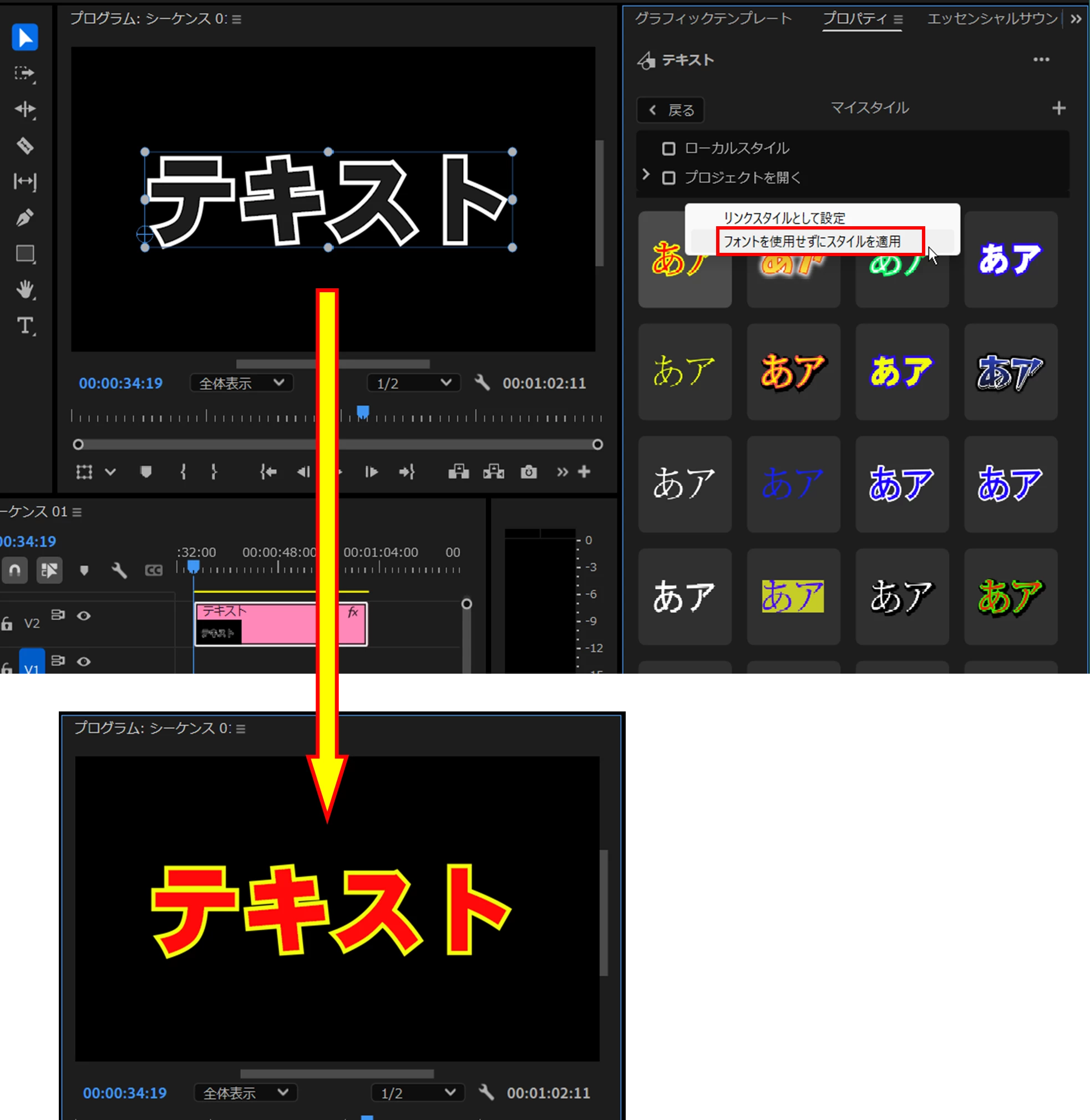 具体的には既に作成してある字幕に対して、スタイルブラウザーからカラーの最適なスタイルを選び、そのうえで右クリックして開いたメニューから「フォントを使用せずにスタイルを適用」を選択すると、カラーの最適なスタイルがフォントを使用せずに適用されます。