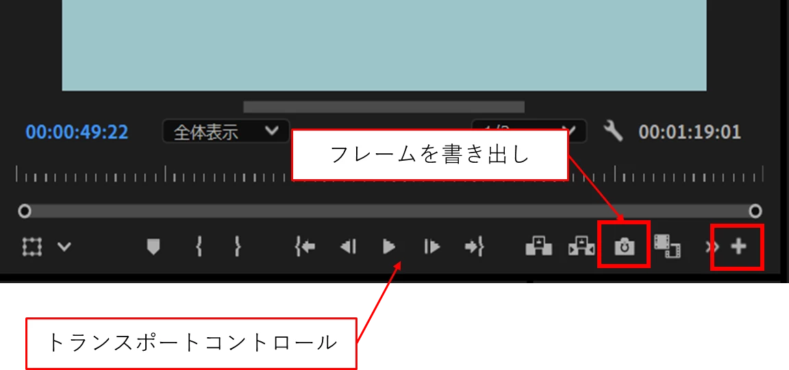 *「フレームを書き出し」アイコンが表示されていない場合は、右側の「+」アイコンをクリックし開いたボタンエディターから「フレームを書き出し」アイコンを「トランスポートコントロール」部へドラッグし「OK」をクリックします。