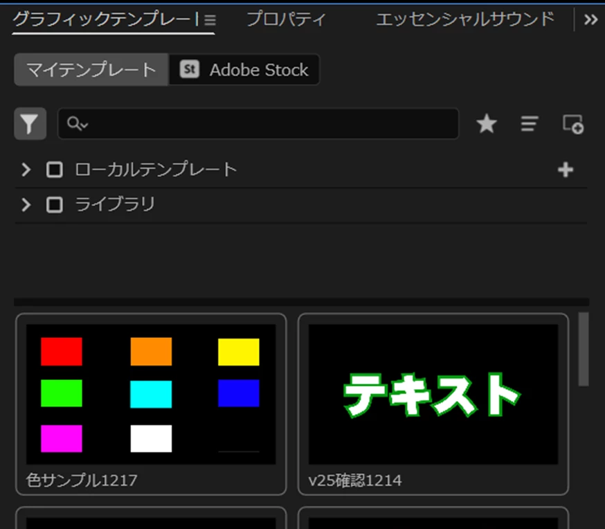 そうしますと、グラフィックテンプレートパネルにて「ローカルテンプレートフォルダ―」にチェックを入れておきますと保存したグラフィックがでてきますので、そこからシーケンスにドラッグ&ドロップすることで使うことができます。