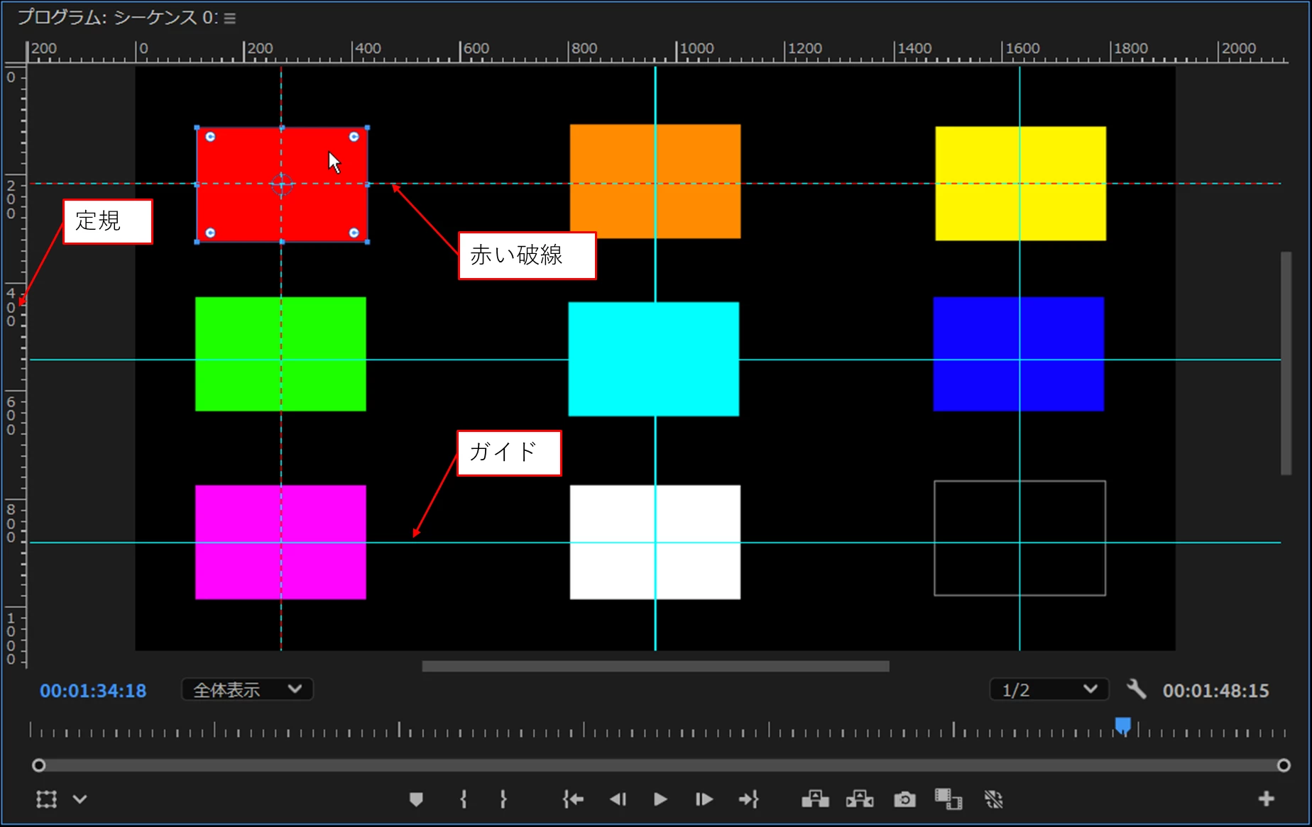 ・各シェイプの配置で、定規とガイドを表示し、「プログラムモニター」右下部の「レンチアイコン」から「プログラムモニターをスナップイン」(ショートカットキーではCommand(Ctrl)キーを押しながらドラッグ)を選択しましたか。