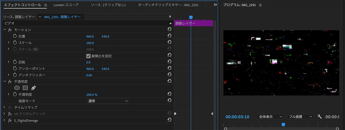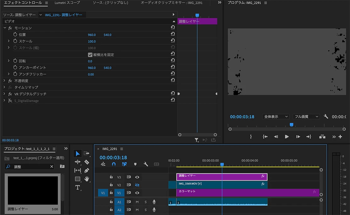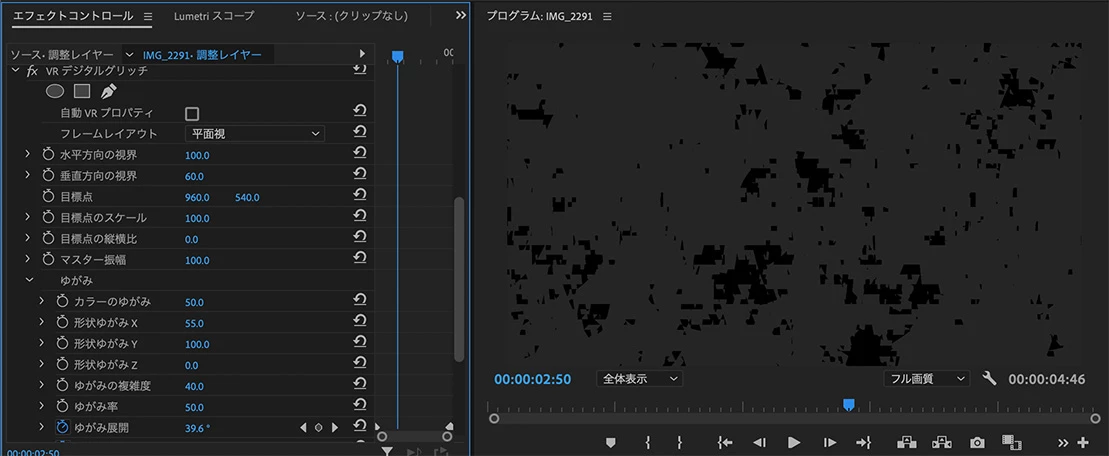 最近プレミアプロを使用し始めました。動画→グリッチ→黒背景の順に映像が消えていくような動画を作りたく、VRデジタルグリッチのエフェクトを使用して、グリッチをかけたのですが、黒背景(カラーマットを使用しました)にグリッチをかけられず困っています。VRデジタルグリッチ以外でもそのような映像を作れたらいいので、いいやり方をご存知でしたら教えていただけるとすごく嬉しいです。よろしくお願いいたします。