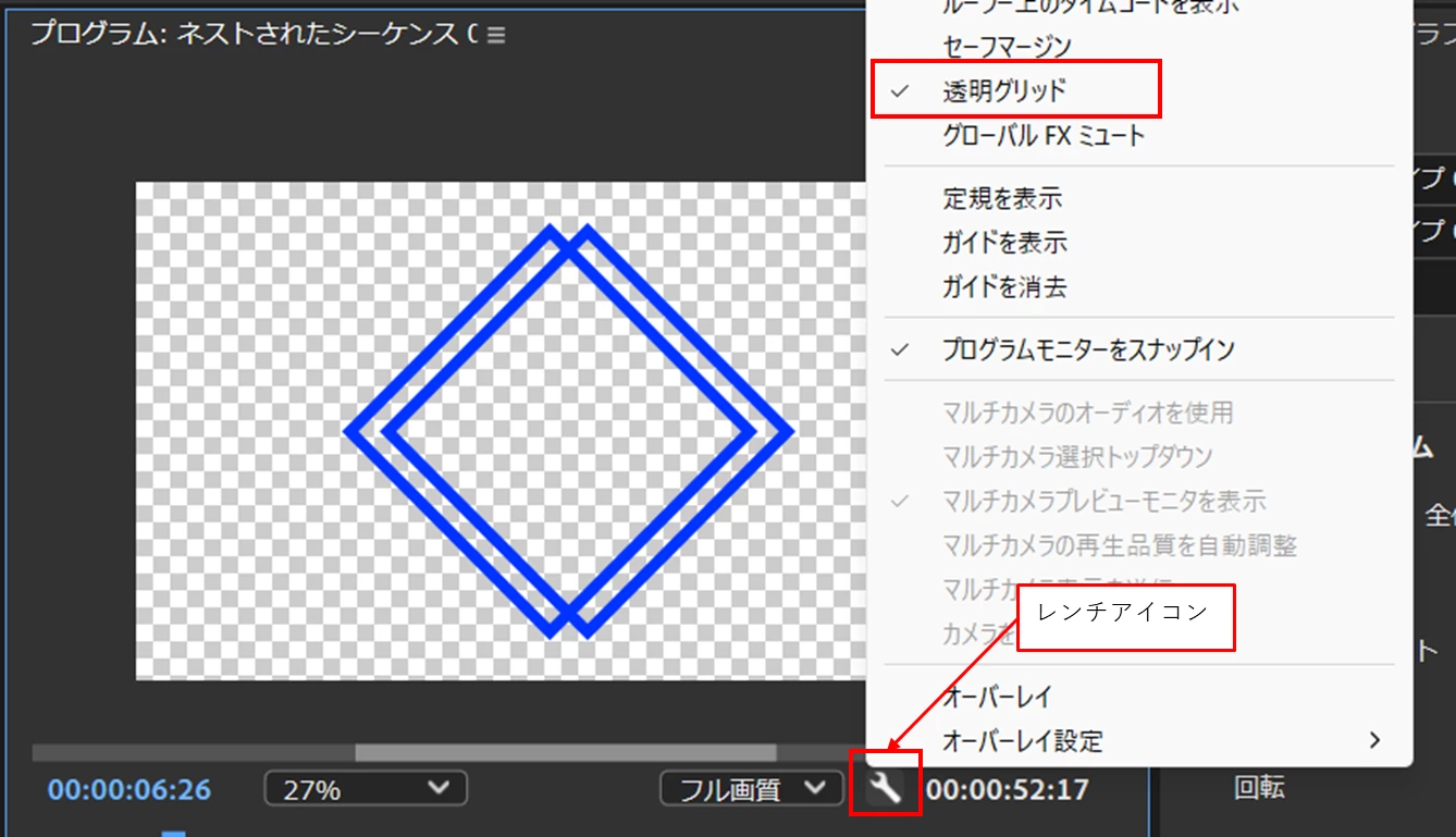 Premiere Proの場合は、通常は透過部分は黒になっていますが、「プログラムモニター」の「レンチ」アイコンをクリックして開いたメニューから「透明グリッド」を選択すると市松模様で表示させることもできます。ただしクリップがない部分は黒で表示されます。
