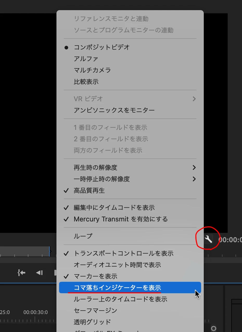 画面右側のレンチアイコン(設定...ボタン)を押していただき、「コマ落ちインジケーターを表示」にチェックを入れると出てくるかと思います。
