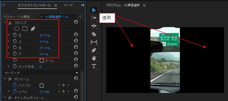 ③クリップを選択したまま、「エフェクトコントロール」パネルの「モーション」の文字の上をクリックします。すると、「プログラムモニター」の画像の周囲にバウンディングボックスが表示されます。