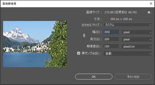 Photoshopの場合は、メニューの「イメージ」→「画像解像度」を選択し、開いた「画像解像度」ウィンドウから画像のフレームサイズを変更できます。