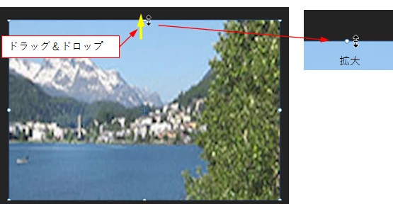 ④もう片方の辺のバウンディングボックスのハンドルを画像がシーケンスサイズに合うまでドラッグ&ドロップします。この操作は拡大率を上げると合わせやすいです。
