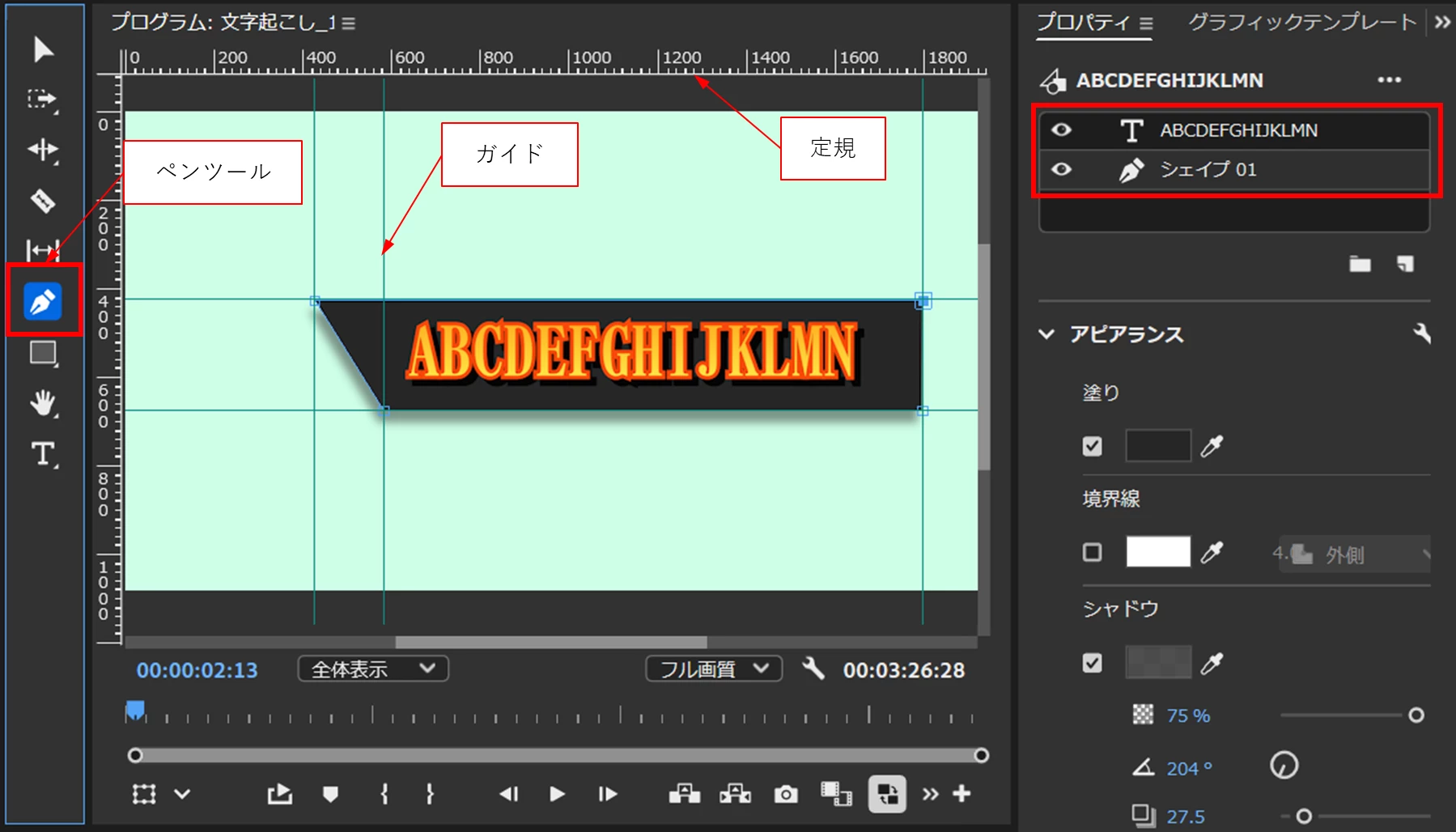*シェイプレイヤーはテキストレイヤーの上側に作成されますが、下側へ移動します。