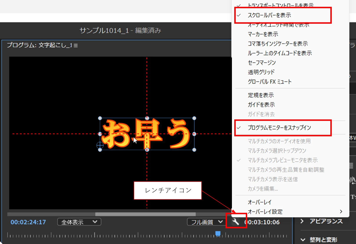 *最初に定規とガイドを表示させて、テロップに合わせてガイドを目印の位置に引いておきます。定規/ガイドを表示するには「プログラムモニター」を選択し、メニューの「表示」→「定規を表示」/「ガイドを表示」を選択します。シェイプが作成できたら、定規とガイドは非表示にします。