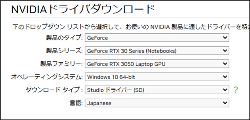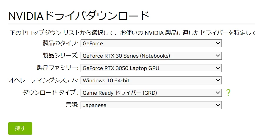 理解できたのです「をお使いの NVIDIA 製品に適したドライバー」がわかりません。。