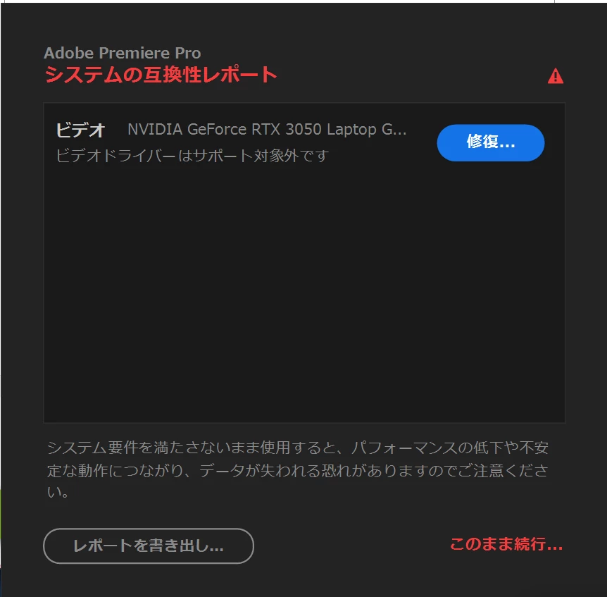 ※「システムの互換性レポート」は、Premiere Pro v13.1から採用された機能で、GPU(グラフィック)の古いドライバーが検出された場合に、不具合等を未然に防ぐために警告を発するものです。